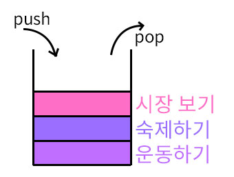 이제 가장 위에 적힌 할 일을 해결하면 위에서부터 포스트잇을 뗄 수 있다. 맨 앞에 적힌 할 일은 "3. 시장 보기"이다. 시장 보기를 완료하고 나면 맨 위의 포스트잇을 제거하고 "2. 숙제하기"를 할 수 있다. 만약에 우리가 맨 위의 "3. 시장 보기"를 완료하지 못하면 다음 할 일을 할 수 없게 된다. 그러니까 우리는 맨 처음에 쓴 "1. 운동하기"를 하기 위해선 시장을 보고 포스트잇을 제거하고 숙제를 하고 포스트잇을 제거를 해야만 한다. 이 때, 할 일 항목을 적어 포스트잇을 붙이는 것을 push라고 하고 붙인 포스트잇을 떼어내고 포스트잇에 적힌 내용을 읽는 것을 pop이라고 한다.