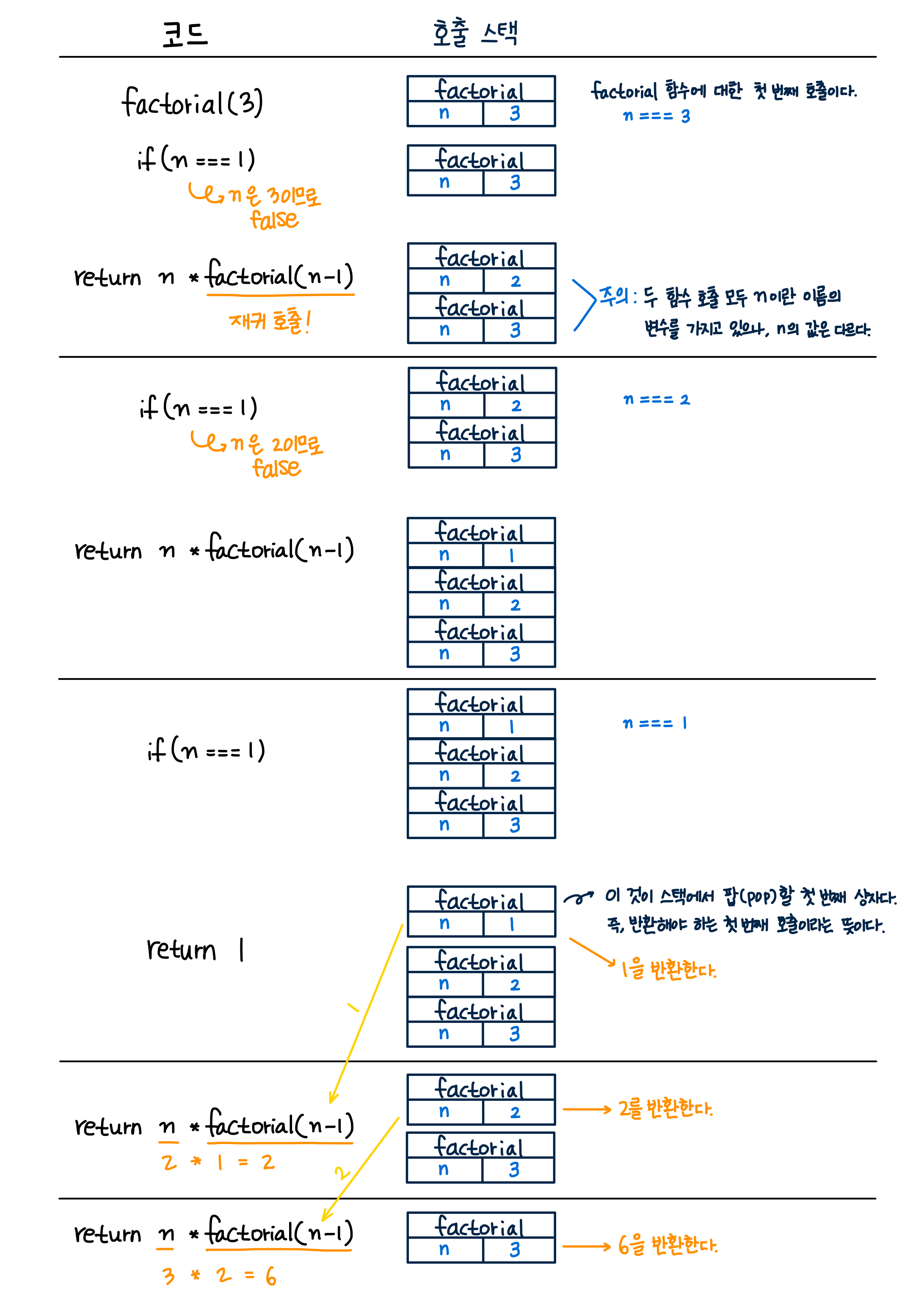 이제 위 코드는 완벽한 재귀 함수의 형태를 하고 있으며, 위 코드의 실행 순서는 다음과 같다.