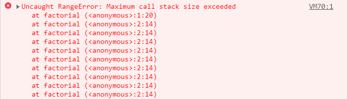 위 코드를 실제로 실행해보면 브라우저는 지구 끝까지 갈 기세로 코드를 계속해서 실행하다가 어느 시점에 저런 에러를 출력하고 멈출 것이다. Maximum call stack size exceeded. 최대 호출 스택 사이즈가 초과되었다. 이 부분이 바로 우리가 재귀 함수를 사용할 때 가장 유의해야하는 부분이다.