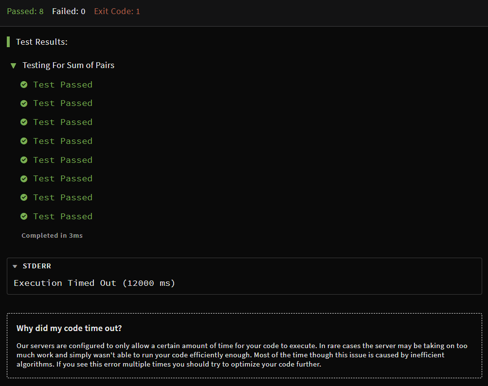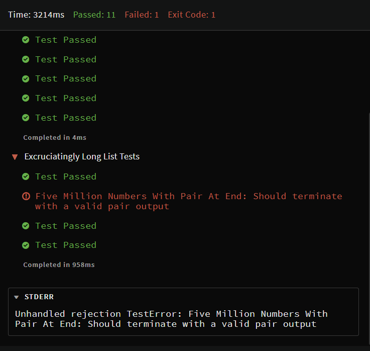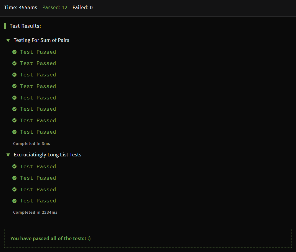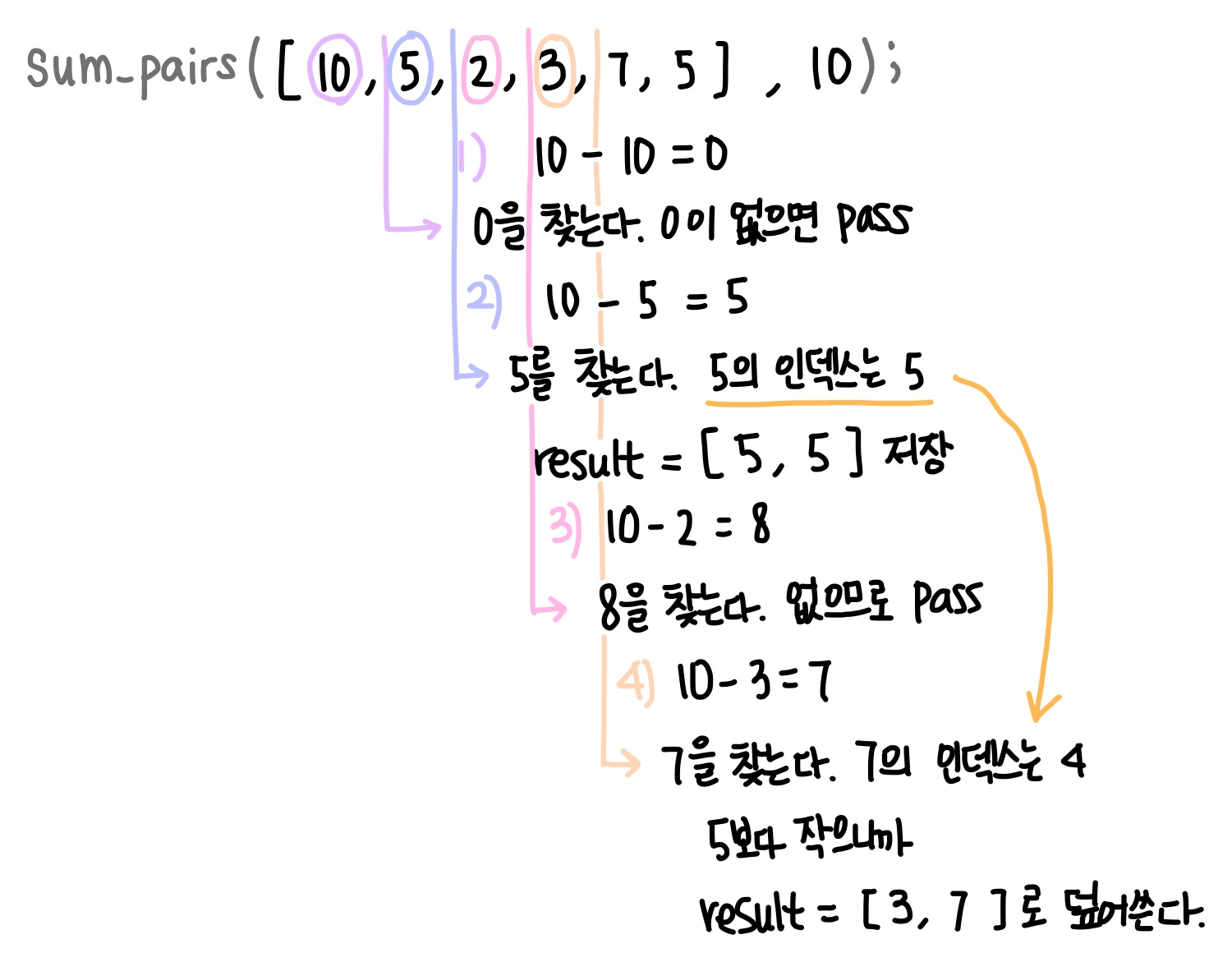 var sum_pairs = function (ints, s) { let findN; let hasN; let result; for (let i = 0; i < ints.length; i++) { findN = s - ints[i]; let search = ints.indexOf(findN, i + 1); if (search !== -1) { if (! hasN || hasN > search) { hasN = search; } result = [ints[i], ints[hasN]]; ints.splice(search + 1); } } return result; }위 로직대로 코드로 쓰고 테스트를 돌렸더니 샘플 테스트는 통과하였으나
