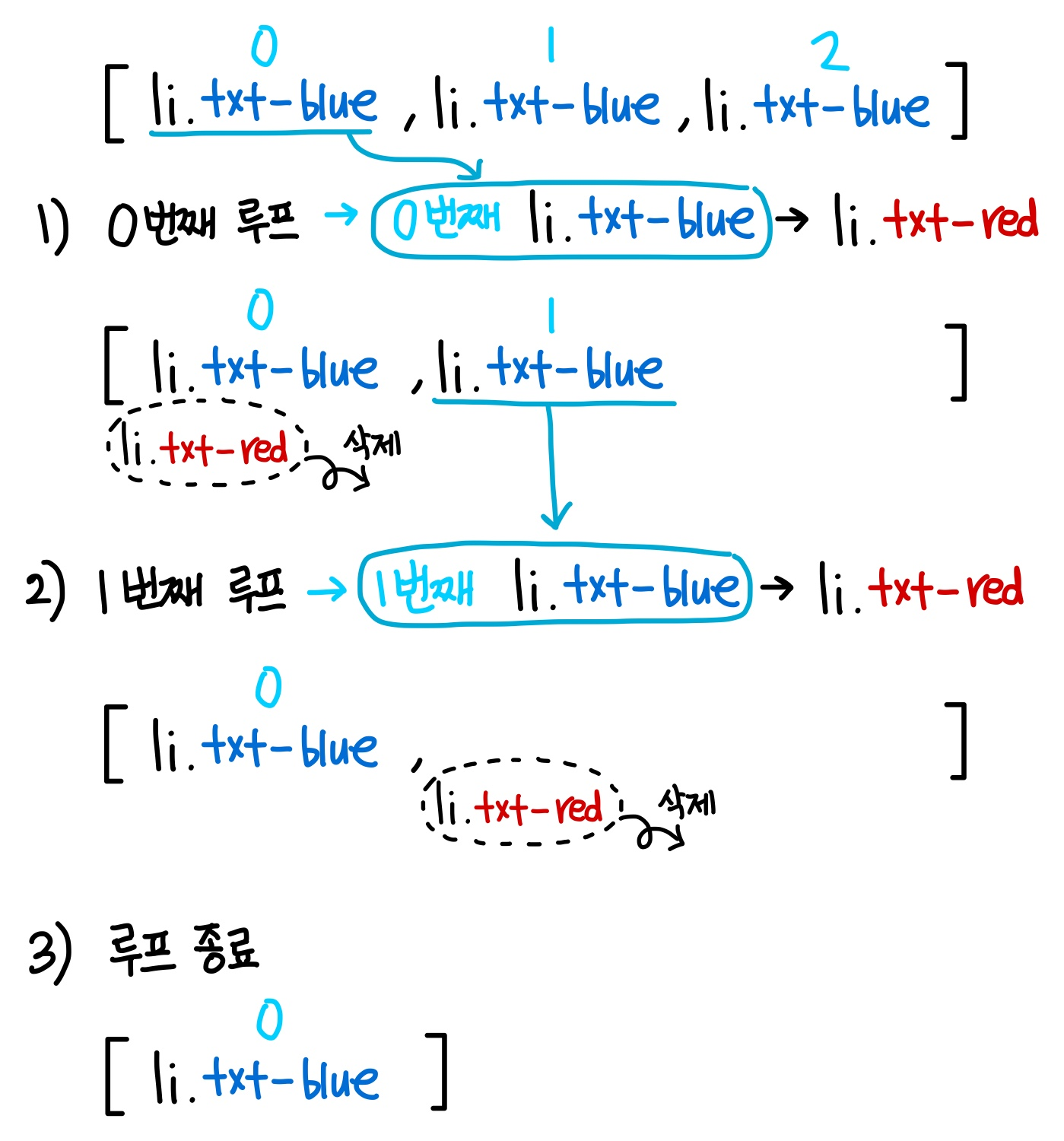 const $li = document.getElementsByClassName('txt-blue'); for (let i = 0; i < $li.length; i++) { $li[i].className = 'txt-red'; i--; }1. 루프를 돌릴 때, class명을 txt-red로 바꾼 후 i 변수를 1 감소시킨다.
