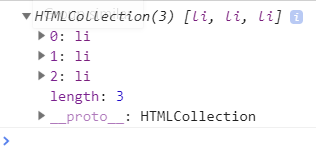 이 경우에도 아까와 똑같이 li 요소를 출력하였으나, 콘솔 창을 잘 보면 NodeList가 아닌 HTMLCollection이 반환된 것을 확인할 수 있다.