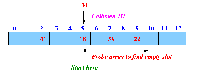 다른 방법은 Linear probing(선형탐사)이다. 선형 탐사는 충돌이 발생한 지점의