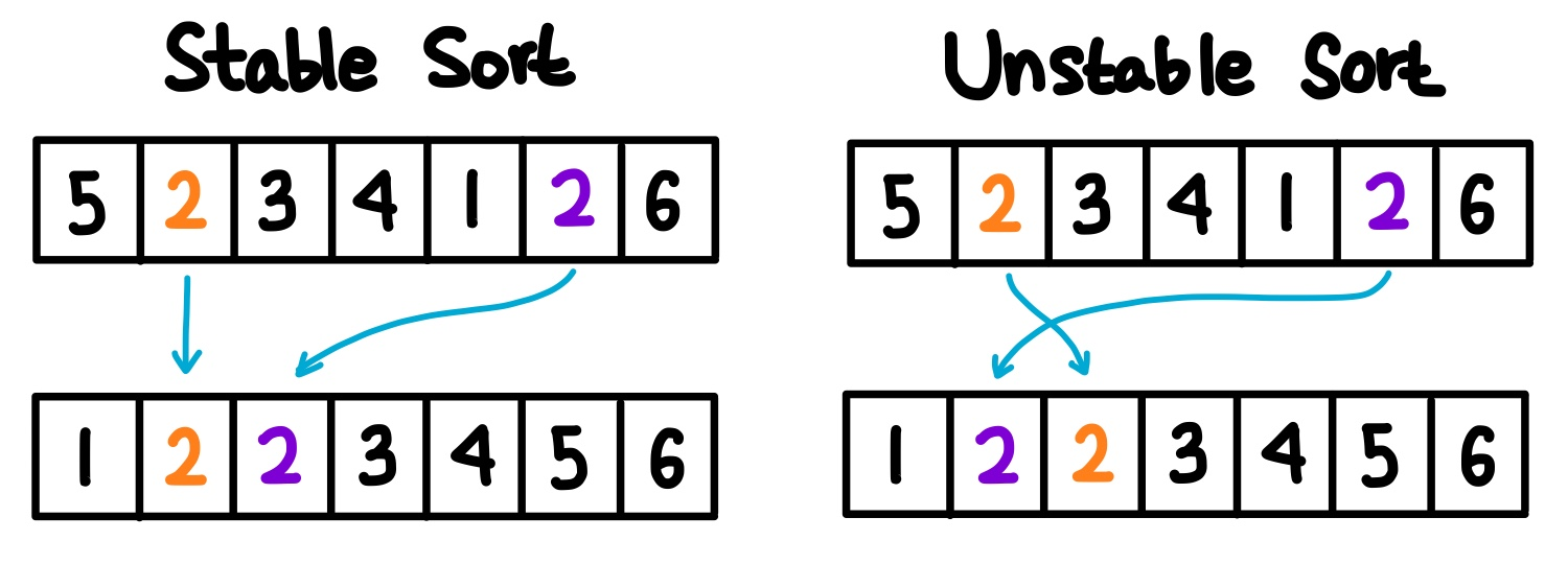 버블 정렬은 중복 데이터가 있을 경우 데이터의 위치를 교환하지 않고 지나가기 때문에 stable한 정렬이다. 여기서 stable이라는 뜻은 중복 데이터가 있는 경우에 기존 중복 데이터의 순서가 정렬이 다 끝난 이후에도 유지되는 정렬을 말한다.