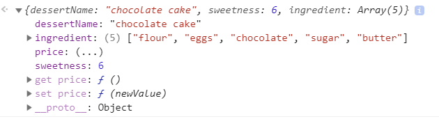 const dessert = { dessertName: 'chocolate cake', sweetness: 6, ingredient: ['flour', 'eggs', 'chocolate', 'sugar', 'butter'] }; let cakePrice = '20$'; Object.defineProperty(dessert, 'price', { enumerable: true, configurable: true, get () { return cakePrice; }, set (newValue) { cakePrice = newValue; } });위 코드를 보면 price 속성을 정의할때 get 함수를 사용하여 전역 공간에 있는 cakePrice 변수를 리턴하라고 되어있다.