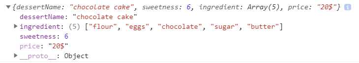 const dessert = { dessertName: 'chocolate cake', sweetness: 6, ingredient: ['flour', 'eggs', 'chocolate', 'sugar', 'butter'] }; Object.defineProperty(dessert, 'price', { value: '20$' });