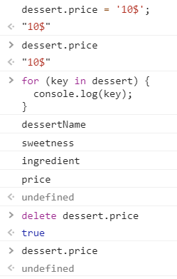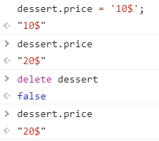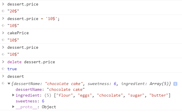 Object.defineProperty(dessert, 'price', { value: '20$', enumerable: true, configurable: true, writable: true });이제 enumerable 키와 configurable, writable 키를 모두 true로 설정하였다.