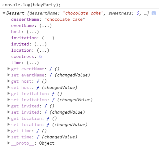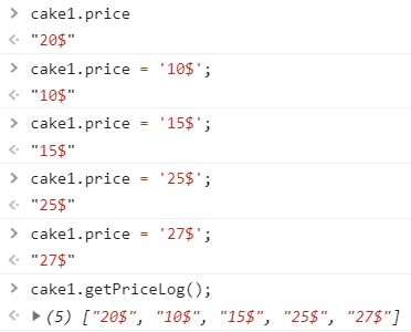 function Dessert (name, sweetness) { const priceLog = ['20$']; let cakePrice = '20$'; this.dessertName = name; this.sweetness = sweetness; Object.defineProperty(this, 'price', { enumerable: true, get () { return cakePrice; }, set (newPrice) { cakePrice = newPrice; priceLog.push(newPrice); } }); this.getPriceLog = function () { return priceLog; } } const cake1 = new Dessert('lemon cake', 8);이제 get과 set을 사용하여 다양한 일들을 할 수 있다.