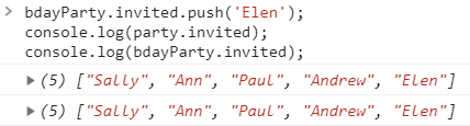 bdayParty 인스턴스는 invited 값을 party 객체에서 읽어오고, party 객체의 invited 배열에 'Elen'을 push하게 된다.