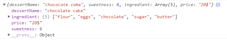 const dessert = { dessertName: 'chocolate cake', sweetness: 6, ingredient: ['flour', 'eggs', 'chocolate', 'sugar', 'butter'] }; dessert.price = '20$';
