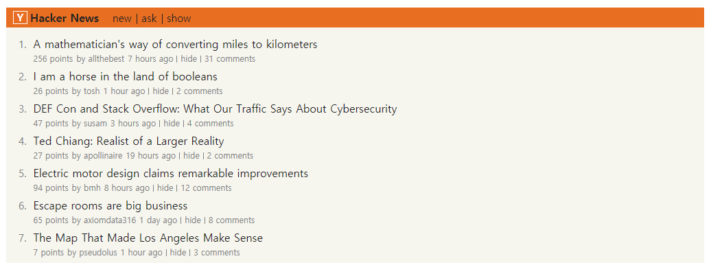 function createList (newsDatas) { $ul.innerHTML = ''; newsDatas.forEach((news, i) => { const $li = document.createElement('li'); const $innerLi = `<span class="list-num">${i + 1}.</span>` +`<a href="${news.url}" class="title" target="_blank">${news.title}</a>` +`<span class="sub-text"><span class="mr5">${(news.score) ? news.score : 0} points</span>` +`<span class="name mr5"><a href="#">by ${news.by}</a></span>` +`<span class="time bar"><a href="#">${getTimeGap(news.time)}</a></span>` +`<span class="bar"><a href="#">hide</a></span>` +`<span class="comments"><a href="#">${(news.kids) ? news.kids.length : 0} comments</a></span></span>`; $li.innerHTML = $innerLi; $ul.appendChild($li); }); }먼저 받아온 데이터를 이용하여 ul 태그안에 li 태그를 동적으로 생성하는 함수를 만들었다.