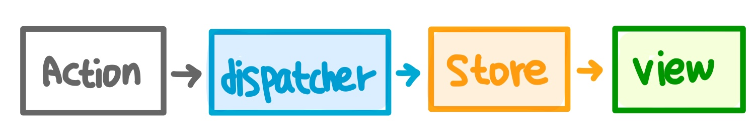 그러나 Flux 패턴은 action이 발생하면 dispatcher에 의해 store에 변경된 사항이 저장되고 그 저장된 사항에 의해 view가 변경되는 단방향 패턴을 보이고 있다. 여기서 dispatcher란 어플리케이션에서 발생한 action들을 정리해주는 역할을 하며 Store란 어플리케이션의 데이터들이 저장되는 장소이다.