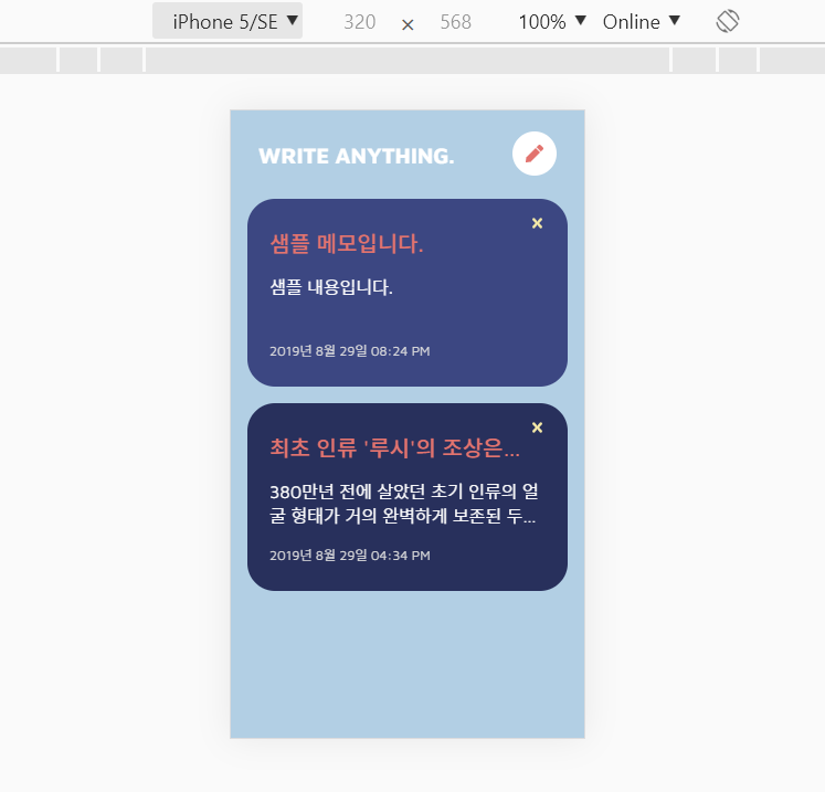 - 페이지를 로딩하면 첫 화면에 메모 작성 버튼과 메모 리스트가 있다.