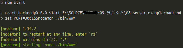 "scripts": { "start": "set PORT=3001&&nodemon ./bin/www" },앱을 실행할 때마다 터미널에 위 명령어를 사용하면 되는데
