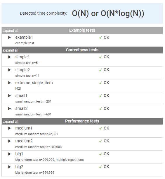 codility는 문제를 풀고나면 이렇게 시간복잡도를 보여줘서 좋은 것 같다.