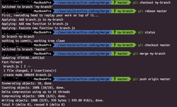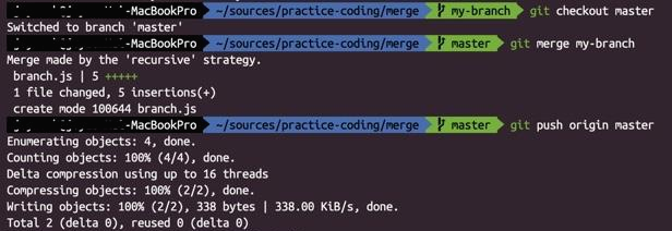 이 경우에 my-branch를 master에 병합하는 방법에는 다음과 같은 것들이 있다.