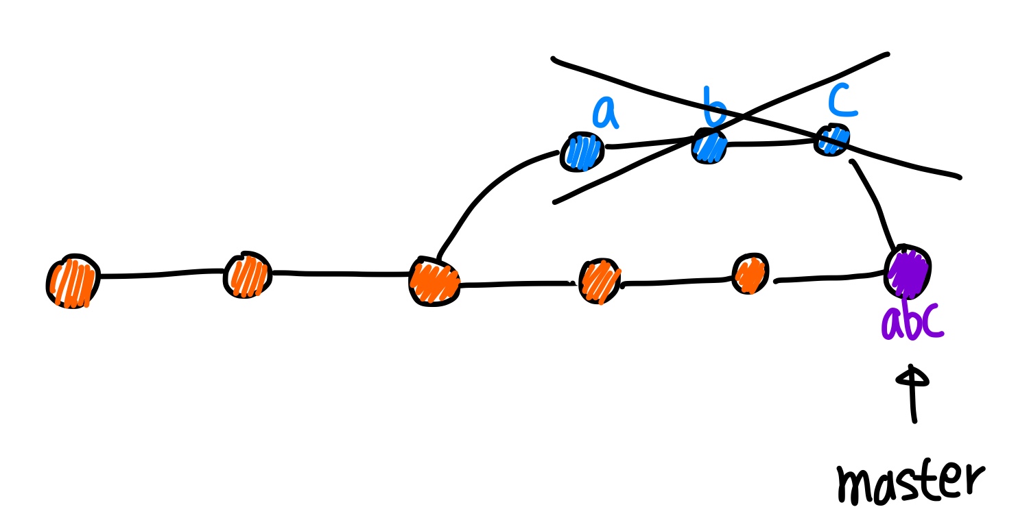 commit a + b + c를 합쳐서 새로운 commit, abc를 만들어지고 master에 추가된다.