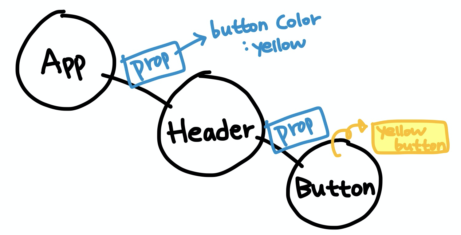 그리고 맨 하위 Button 컴포넌트의 button 색깔을 상위 컴포넌트의 prop으로 받는다고 했을 때 아래와 같은 구조가 될 것이다.