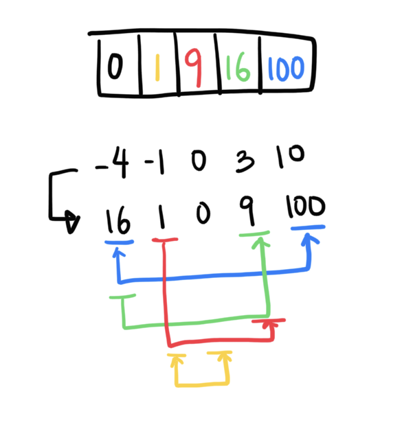 /** * @param {number[]} nums * @return {number[]} */ var squareNum = function(num) { return Math.abs(num) ** 2; }; var sortedSquares = function(nums) { return nums.map(squareNum).sort((l, r) => l - r) };처음에는 일단 (시간 복잡도가 O(n)이 되도록 하라는) 문제의 요구사항을 무시하고 일단 되는대로 풀었다.