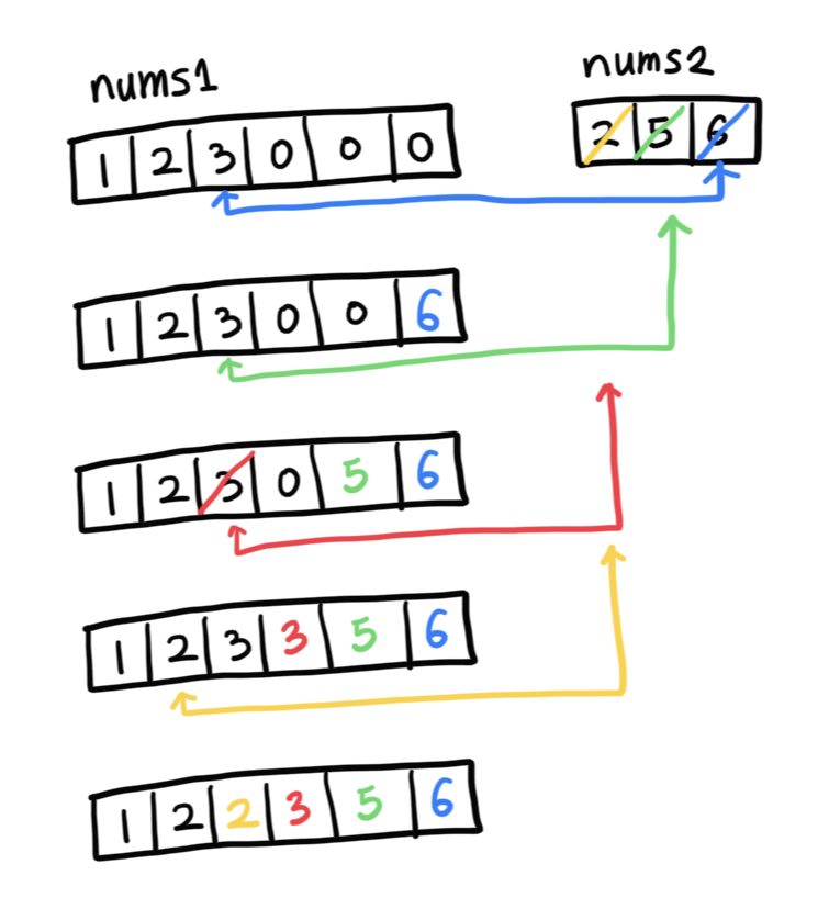 오로지(!) nums1 배열 안에서 알아서 잘 정렬을 해야한다는게 어려움의 포인트...
