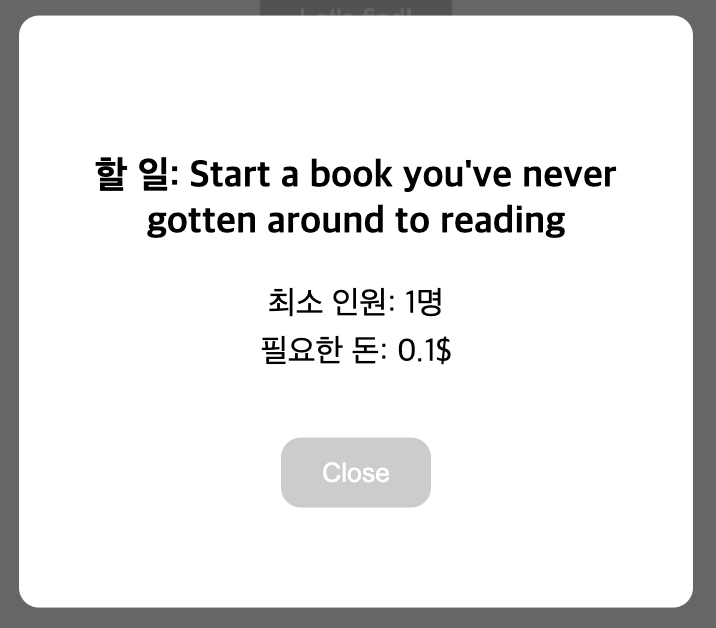 첫 화면에서 Let's find!라는 버튼을 누르면 모달이 뜨고, 잠깐의 로딩을 거쳐 할 일에 대한 정보를 유저에게 보여준다.
