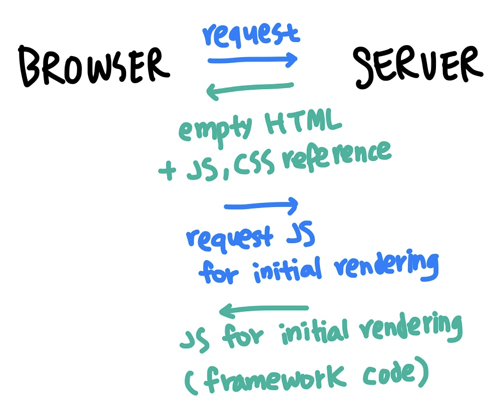 그 외에도 페이지 렌더링을 위해 많은 양의 자바스크립트 코드가 실행되다보니 성능적인 이슈도 생겨났다. 특히 클라이언트 사이드 렌더링 방식은 첫 페이지 로딩이 느리다. 왜냐하면 최초로 서버에서 받은 빈 HTML은 페이지 로드에 필요한 자바스크립트를 참조하고 있는데, 클라이언트에서 렌더링할 때 페이지 로드에 필요한 자바스크립트 코드, 프레임워크나 라이브러리 소스 코드를 모두 불러오기 때문이다. (물론 페이지를 한 번 렌더링하고 난 이후에는 필요한 부분만 렌더링하기 때문에 비교적 효율적이다.)
