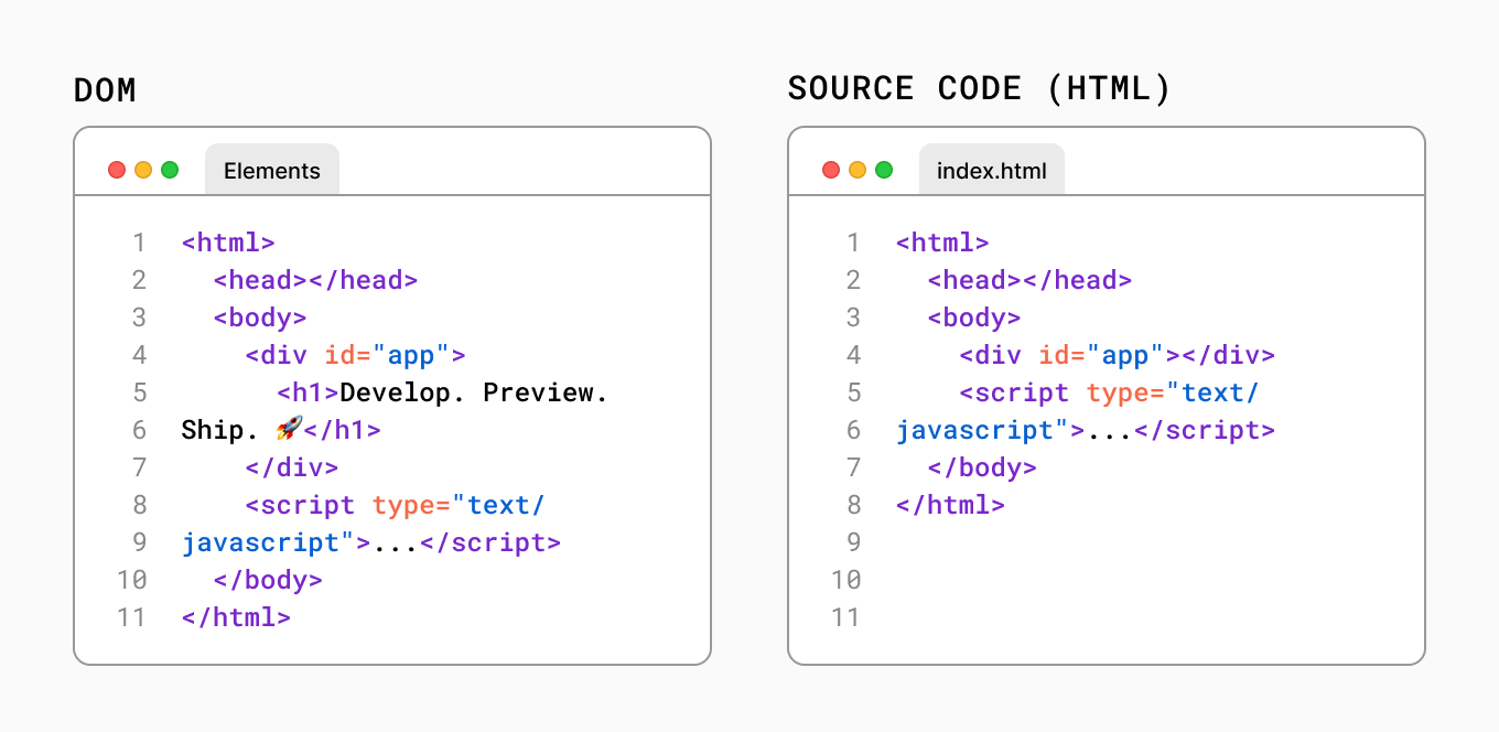 <!-- index.html --> <script type="text/javascript"> const app = document.getElementById('app'); const header = document.createElement('h1'); const headerContent = document.createTextNode('Develop. Preview. Ship. 🚀'); header.appendChild(headerContent); app.appendChild(header); </script>앱의 사이즈와 팀이 커지면 이런 식으로 어플리케이션을 만드는 것은 엄청난 도전이 될 것이다.