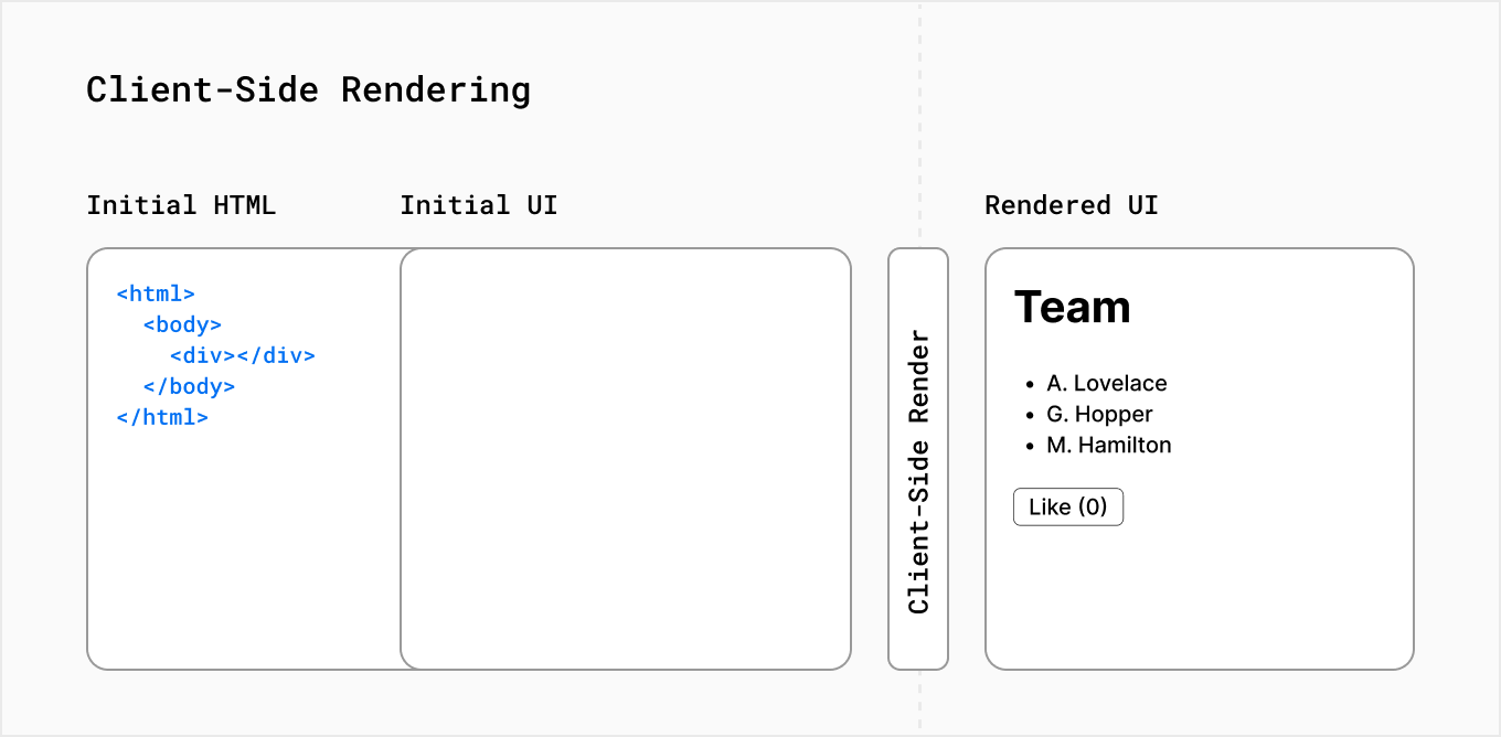 표준 리액트 어플리케이션에서 브라우저는 서버로부터 빈 HTML 껍데기와 UI를 구축할 수 있는 JavaScript로 된 지시사항들을 받게 된다. 이 것을 client-side rendering이라고 부르는데 이유는 초기 렌더링이 유저 디바이스에서 일어나기 때문이다.