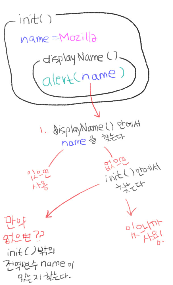 그러나 만약에 displayName()함수 안에 var name = 'Webkit'이 있었다면 alert창에는 Mozilla대신 Webkit이 출력됐을 것이다.