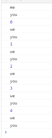 var i = 0; function init() { console.log('me'); } function isValid() { console.log('you'); return i < 5; } function update() { console.log('we'); i++; } for(init(); isValid(); update()) { console.log(i); }
