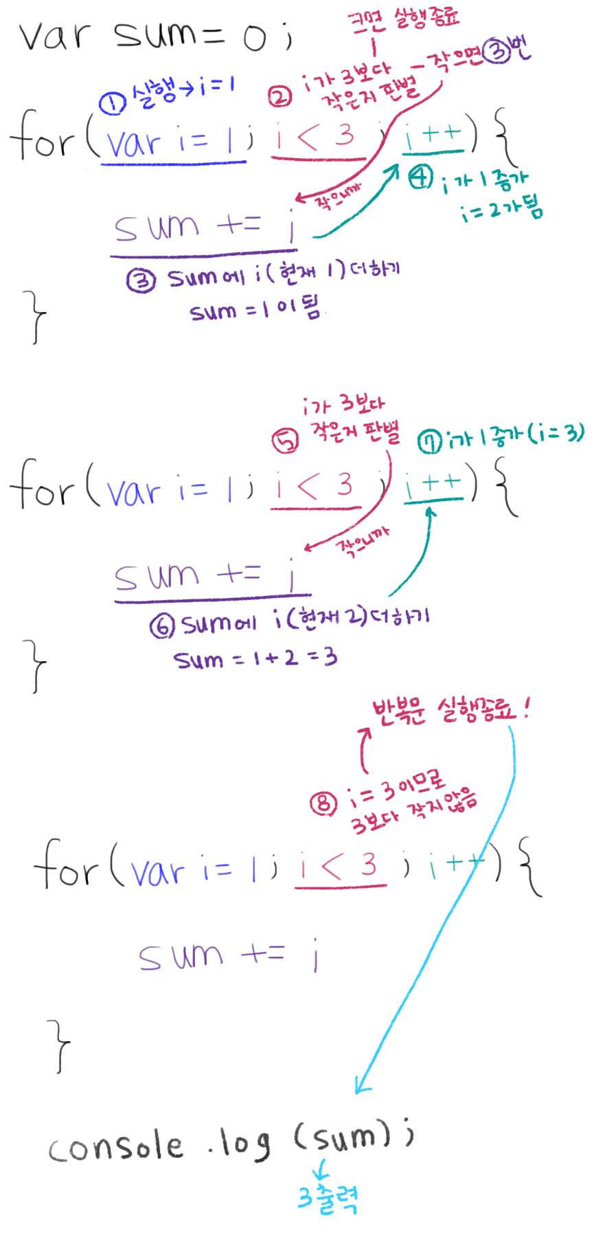 var sum = 0; for(var i=1; i<11; i++) { sum += i; }for문의 동작 원리는 다음과 같다.