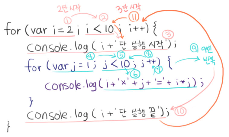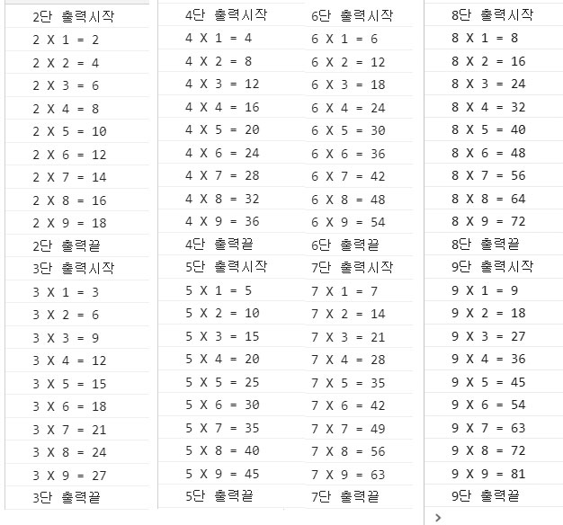 for(var i=2; i<10; i++) { console.log(i+'단 출력 시작'); for(var j=1; j<10; j++) { console.log(i + ' X ' + j + ' = ' + i*j); } console.log(i+'단 출력 끝'); }