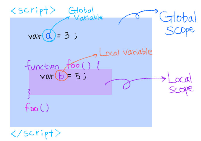 스코프란 일종의 "범위"와 같은 것이다. 어떤 변수를 선언하였을 때, 그 변수에 접근할 수 있는 범위라고 생각하면 쉽니다. 스코프에는 Global(전역)과 Local(지역)이 있는데, Global scope는 말 그대로 어떤 함수에 종속되어있지 않고 어디서나 접근할 수 있는 전역 범위를 말한다. 반면, Local scope는 어떤 함수나 블록 단위로 국한되는 범위를 말한다.
