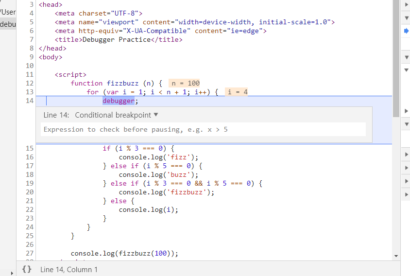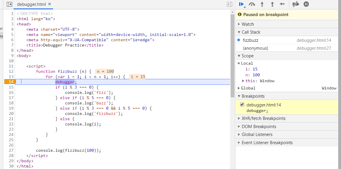 function fizzbuzz (n) { for (var i = 1; i < n + 1; i++) { if (i === 15) { debugger; } if (i % 3 === 0) { if (i % 5 === 0) { console.log('fizzbuzz'); } console.log('fizz'); } else if (i % 5 === 0) { console.log('buzz'); } else { console.log(i); } } }이제 이렇게 코드를 고쳐서 디버깅을 해보면..(!)