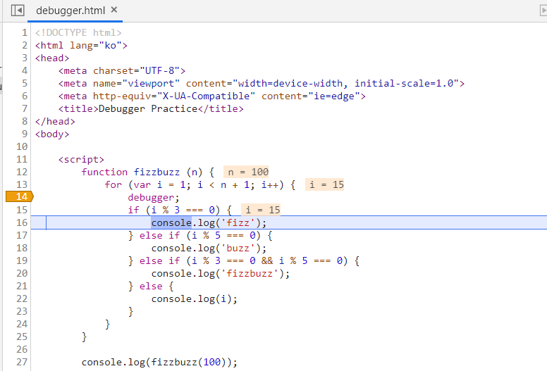 이제 나는 i가 15일 때 왜 "fizzbuzz"가 출력되지 않는지 궁금하기 때문에