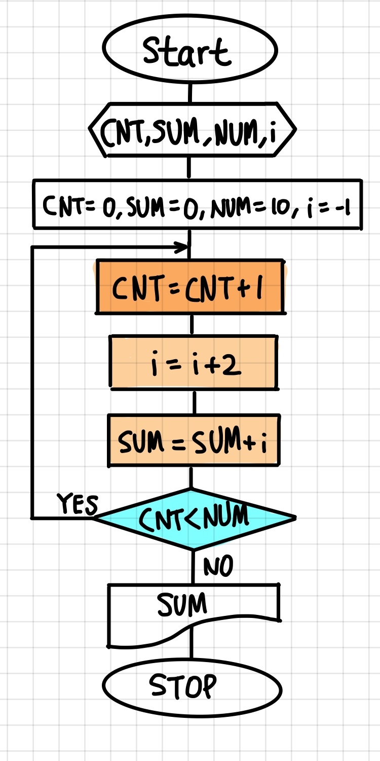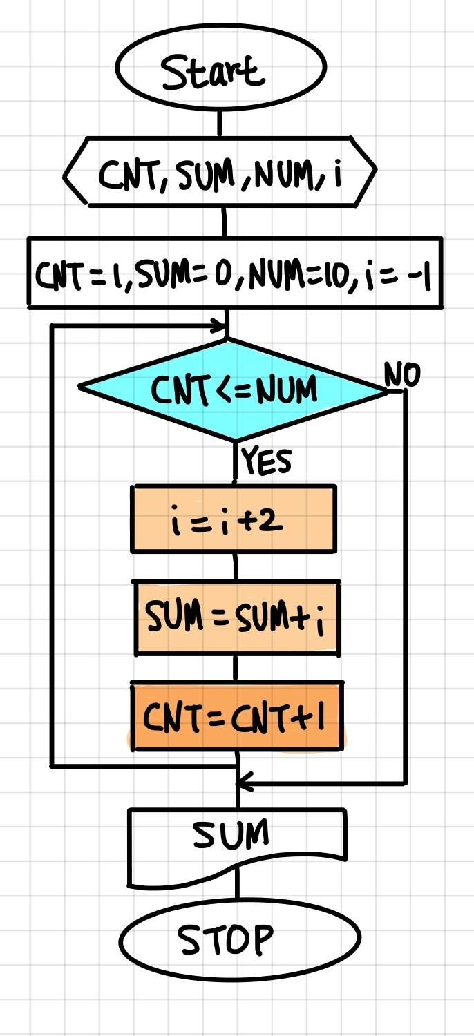 #include <stdio.h> #define NUM 10 int main() { int cnt = 0, sum = 0, i = -1; while (cnt < NUM) { cnt = cnt++; i = i + 2; sum = sum + i; printf("cnt=%2d, i=%2d, sum=%5d\n", cnt, i, sum); } printf("----------반복문 종료-------------\n"); printf("cnt=%2d, i=%2d, sum=%5d\n", cnt, i, sum); system("pause"); return 0; }이제 1 + 3 + 5 + 7 + ... + 10 을 해야한다고 생각해보자.