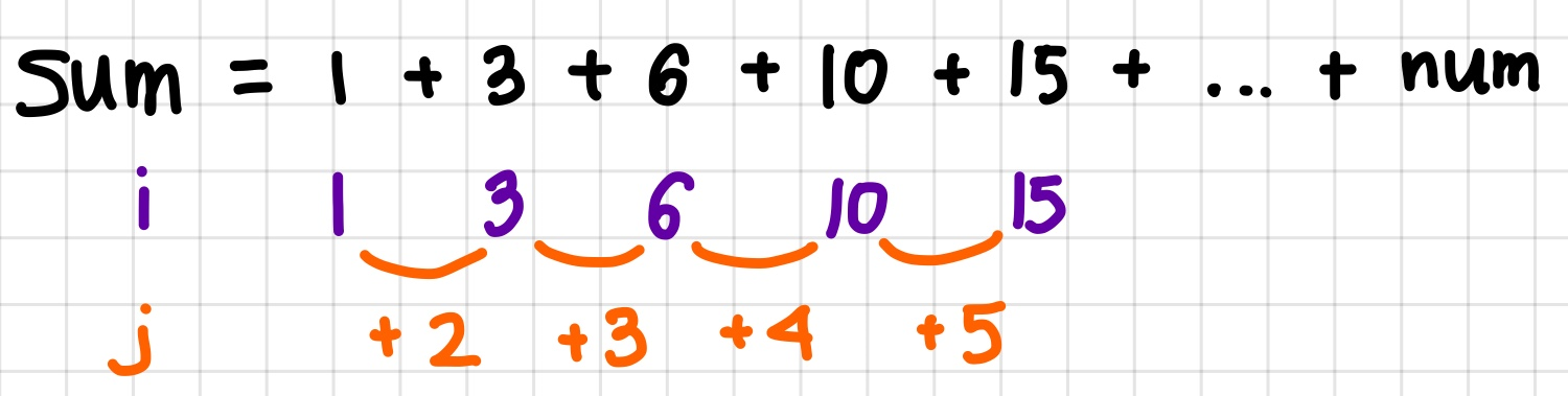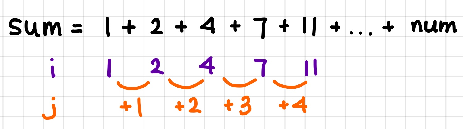 그래서 j에는 1을 더하고, i에는 그 j를 더하고, sum에 i를 더해야 한다.
