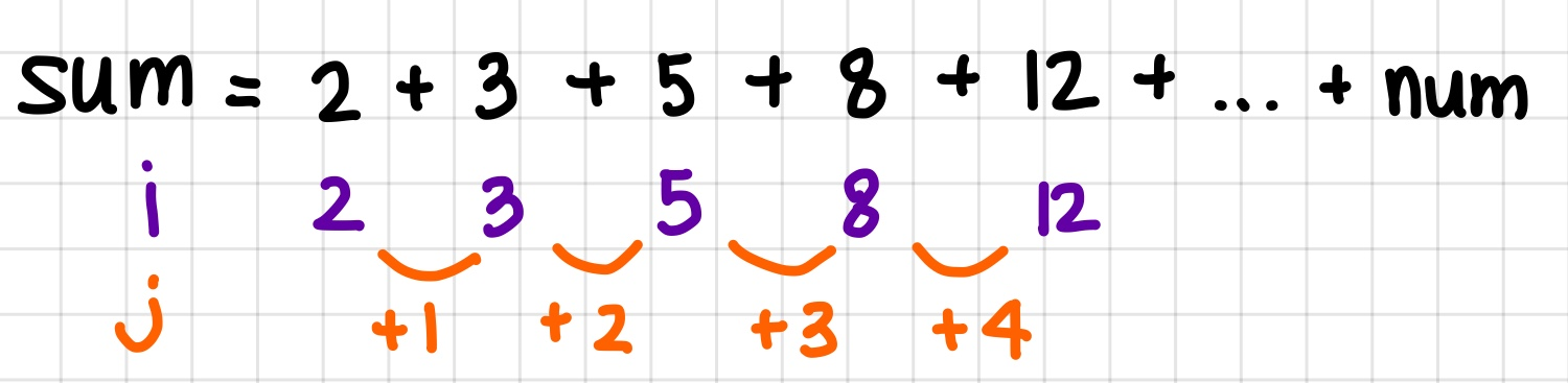 1. Sum= 2 + 3 + 5 + 8 + 12 + ... +(NUM항)의 합