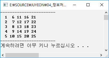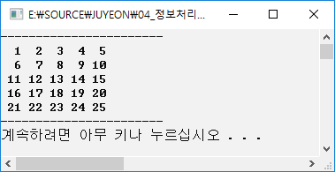 #include <stdio.h> int main() { int row, col, i, j, k = 0; int arr1[5][5] = { 0 }; //사각형 도형 채우기 printf("-----------------------\n"); for (row = 0; row < 5; row++) { for (col = 0; col < 5; col++) { k = k + 1; arr1[row][col] = k; } } for (i = 0; i < 5; i++) { for (j = 0; j < 5; j++) { printf("%3d", arr1[i][j]); } printf("\n"); } printf("-----------------------\n"); system("pause"); return 0; }이제 행과 열이 필요하므로 2차원 배열을 사용해서 출력할 수밖에 없다.