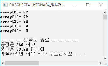 #include<stdio.h> #define NUM 5 int main(void) { int array[NUM] = { 87,99,80 }; int total = 0, cnt; double avg; for (cnt = 0; cnt < NUM; cnt++) { printf("array[%d]=%3d \n", cnt, array[cnt]); } printf("\n"); for (cnt = 0; cnt < NUM; cnt++) { total = total + array[cnt]; } printf("----------반복문 종료-------------\n"); printf("총점은 %d 이고 \n", total); avg = (double)total / NUM; printf("평균은 %.2lf 입니다\n", avg); system("pause"); return 0; }이제 배열의 값들을 반복문을 사용하여 total이란 변수에 누적해서 더한 후, 평균값을 구해서 출력하였다.