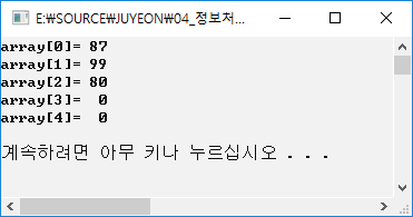 #include<stdio.h> #define NUM 5 int main(void) { int array[NUM] = { 87, 99, 80 }; // array[0] = 87, array[1] = 99, array[2] = 80, array[3] = 0, array[4] = 0; int cnt; for (cnt = 0; cnt < NUM; cnt++) { printf("array[%d]=%3d \n", cnt, array[cnt]); } printf("\n"); system("pause"); return 0; }C언어에서 배열의 선언은 arrayName[5] 이런 식으로 한다.