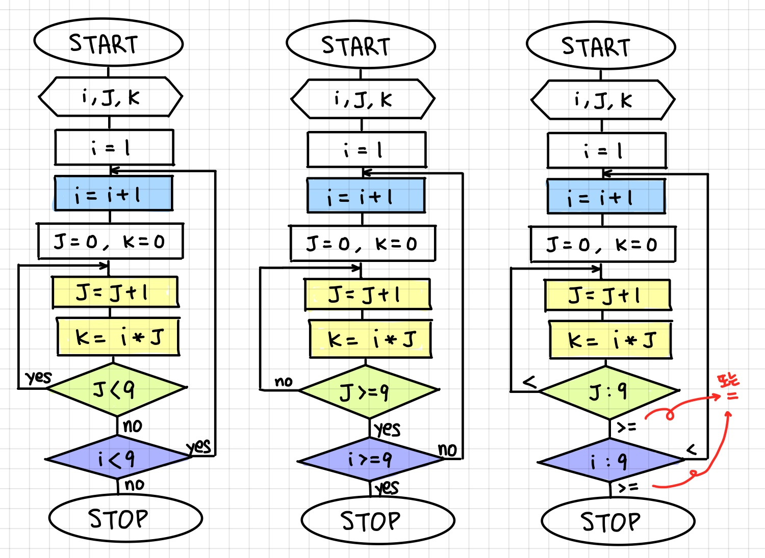 [4] J와 K의 초기값은 0이다. (J는 i에 곱할 1부터 9까지의 숫자를 담을 변수 / K는 i와 J의 곱을 담을 변수)
