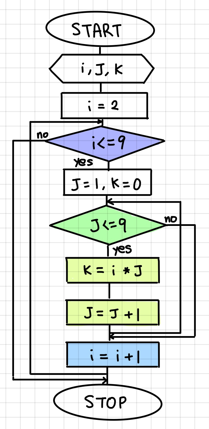 #include <stdio.h> int main() { int i, j, k; i = 1; AA: i++; // i = i + 1; j = 0, k = 0; BB: j++; // j = j + 1; k = i * j; printf("%2d * %2d = %2d \n", i, j, k); if (j < 9) { goto BB; } printf("-----%d단 종료---- \n", i); if (i < 9) { goto AA; } printf("---구구단 종료--------- \n"); printf("i=%2d, j=%2d, k=%2d \n", i, j, k); system("pause"); return 0; }위 Flow chart를 C언어 goto문으로 표현하면 이렇게 표현된다.