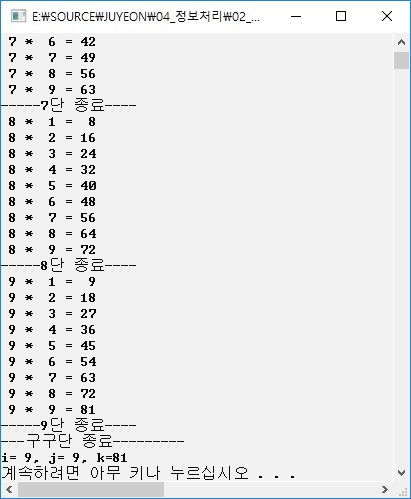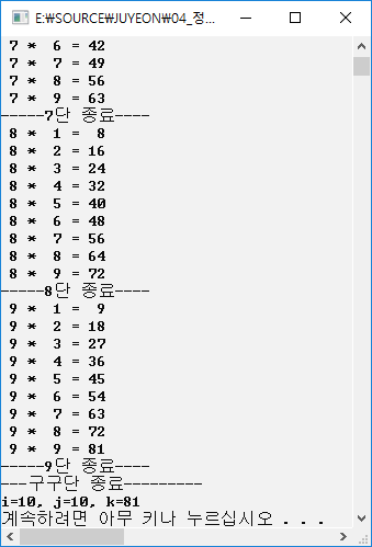#include <stdio.h> int main() { int i, j, k; for (i = 2; i <= 9; i++) { for (j = 1; j <= 9; j++) { k = i * j; printf("%2d * %2d = %2d \n", i, j, k); } printf("-----%d단 종료---- \n", i); } printf("---구구단 종료--------- \n"); printf("%2d * %2d = %2d \n", i, j, k); system("pause"); return 0; }그니까 문제는 이거다.