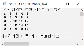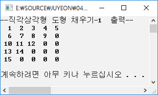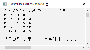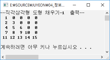 #include <stdio.h> #define NUM 5 int main() { int i, j, k=0; int arr1[NUM][NUM] = { 0 }; for (i = 0; i < NUM; i++) { for (j = 0; j <= i; j++) { k = k + 1; arr1[i][j] = k; } } printf("--직각삼각형 도형 채우기-1 출력--\n"); for (i = 0; i < NUM; i++) { for (j = 0; j < NUM; j++) { printf("%3d", arr1[i][j]); } printf("\n"); } printf("\n"); system("pause"); return 0; }